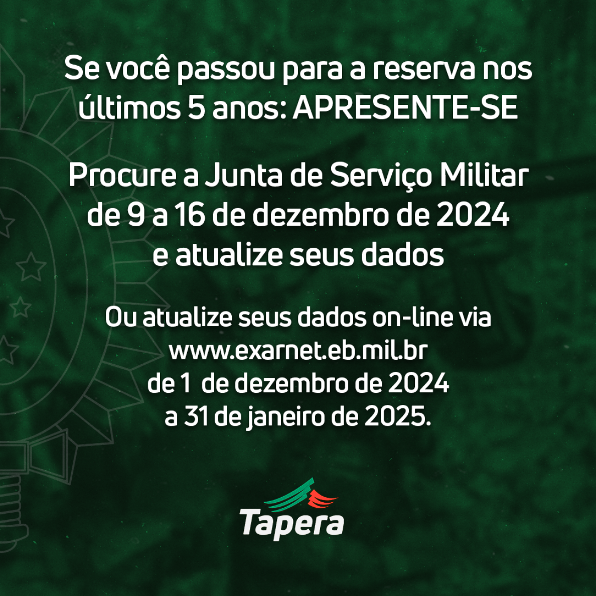 Procure a Junta de Serviço Militar de 9 a 16 de dezembro de 2024 ou atualize seus dados on-line via exarnet de 1º de dezembro de 2024 a 31 de janeiro de 2025.