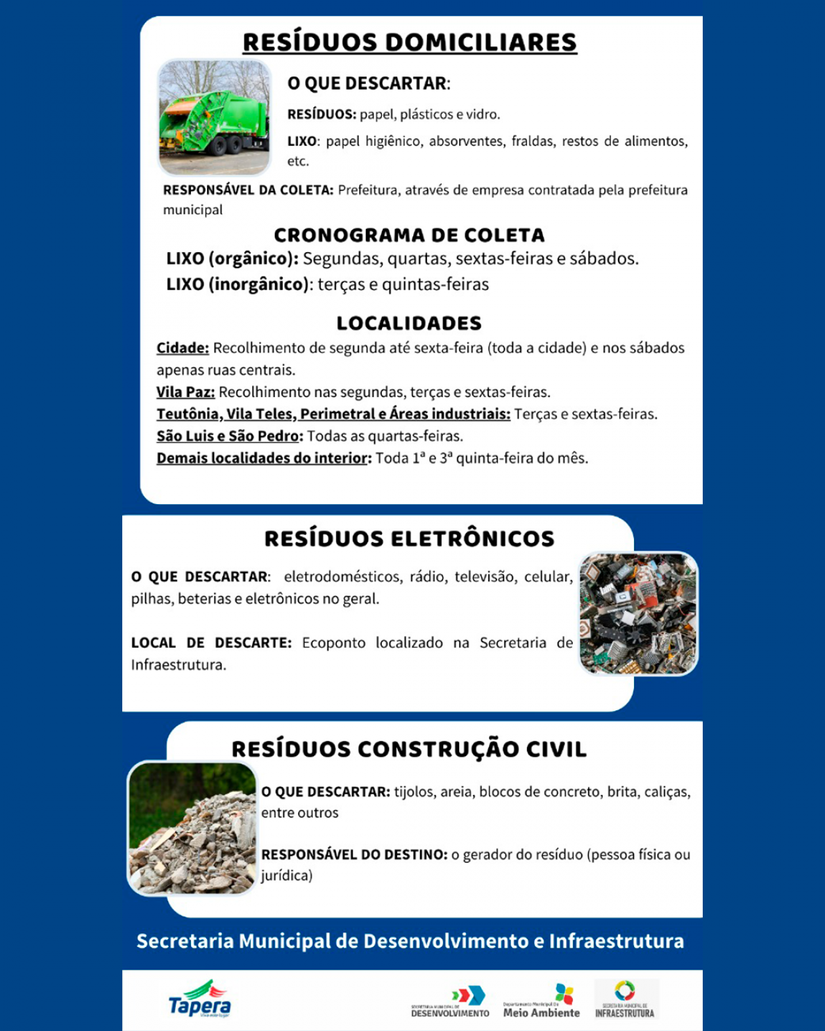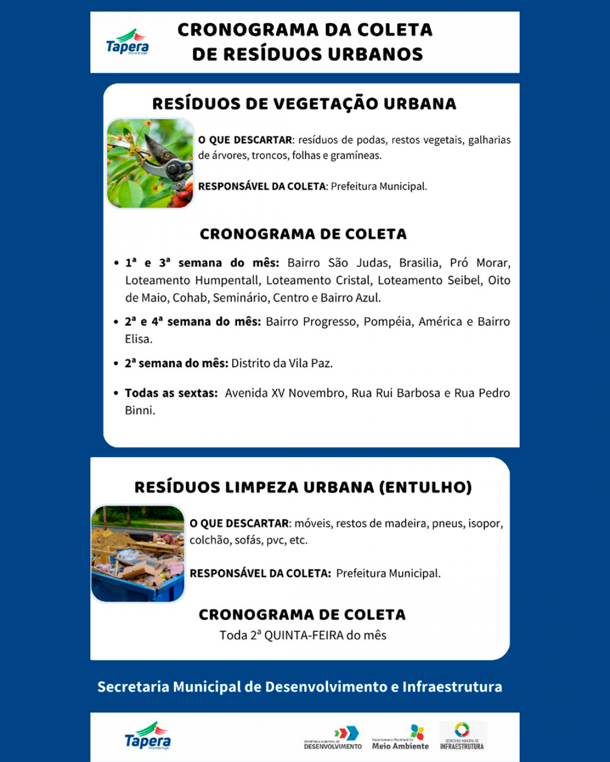 Confira agora a atualização do cronograma da coleta de resíduos em Tapera. Coleta seletiva, realizada pela empresa NOVO MUNDO: Segunda-feira: resíduos orgânicos Terça-feira: resíduos recicláveis (seco) Quarta-feira: resíduos orgânicos Quinta-feira: resíduos recicláveis (seco) Sexta-feira: resíduos orgânicos *RESTOS DE CONTRUÇÃO E ENTULHOS: RESPONSÁBILIDADE DO PROPRIETÁRIO (deverá depositar em uma caçamba de entulho e contratar um empresa que colete) Coleta de materiais volumosos, realizada pela prefeitura: Móveis, sofá, pvc, madeira e afins: 2ª quinta-feira do mês