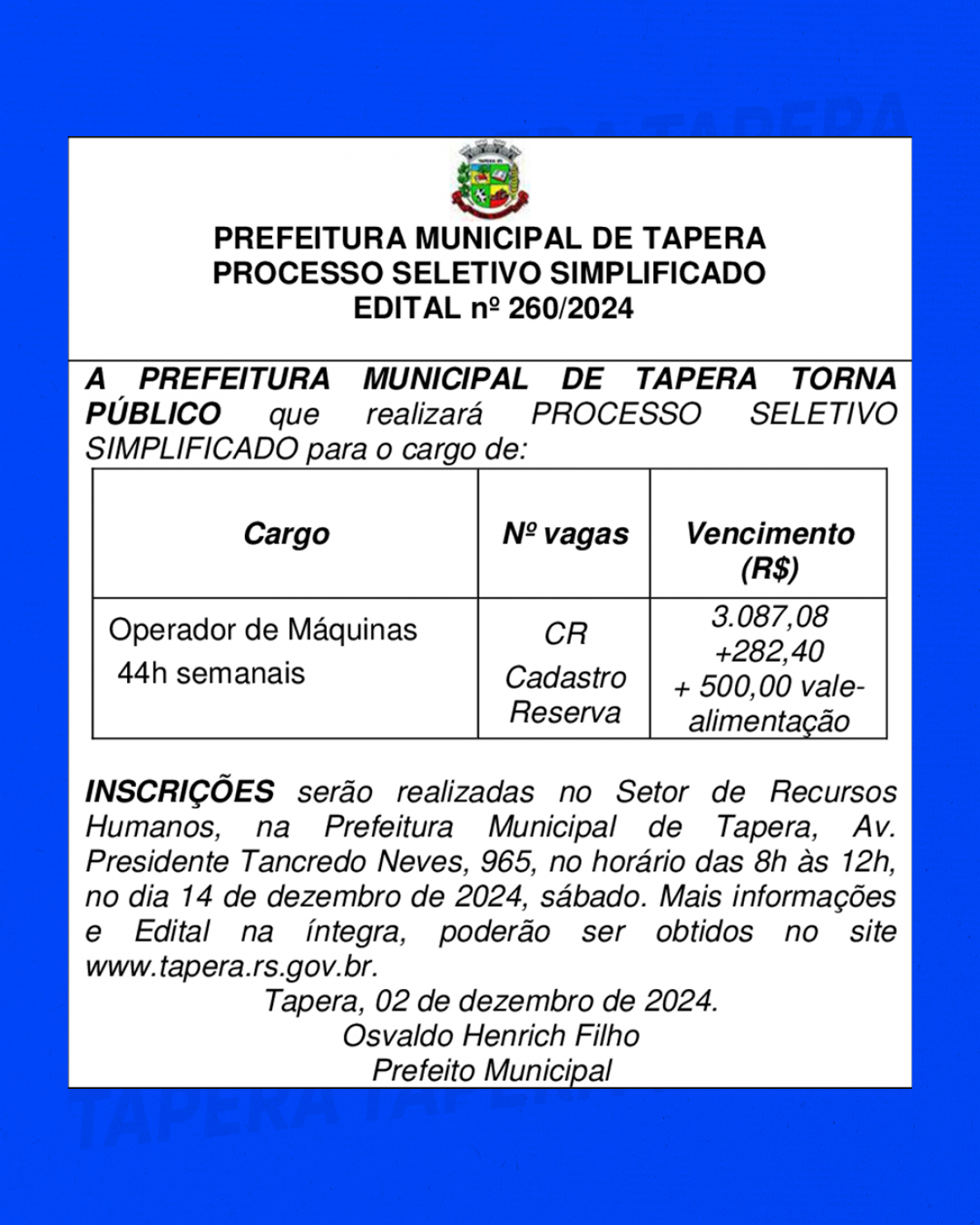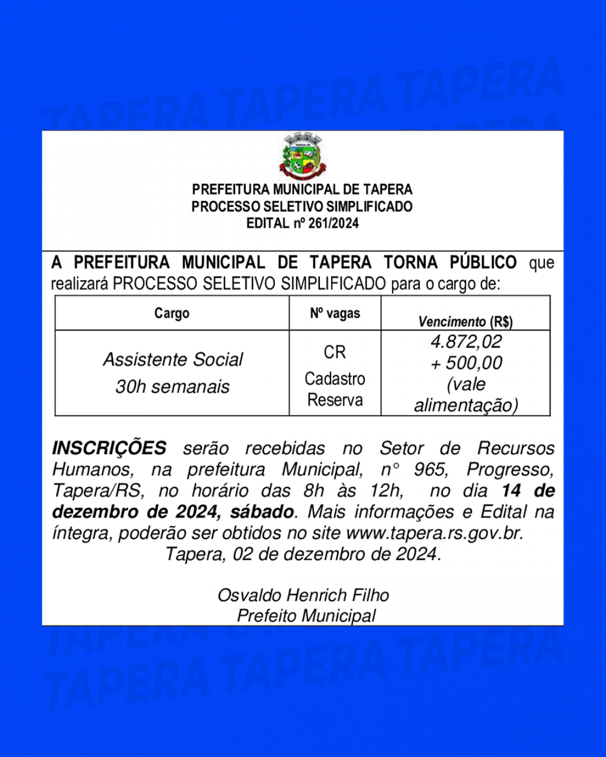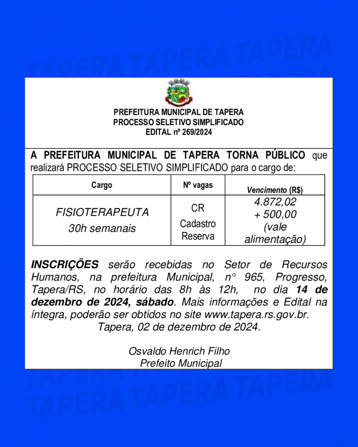 Inscrições somente no dia 14 de dezembro, mais informações no site da Prefeitura de Tapera.
