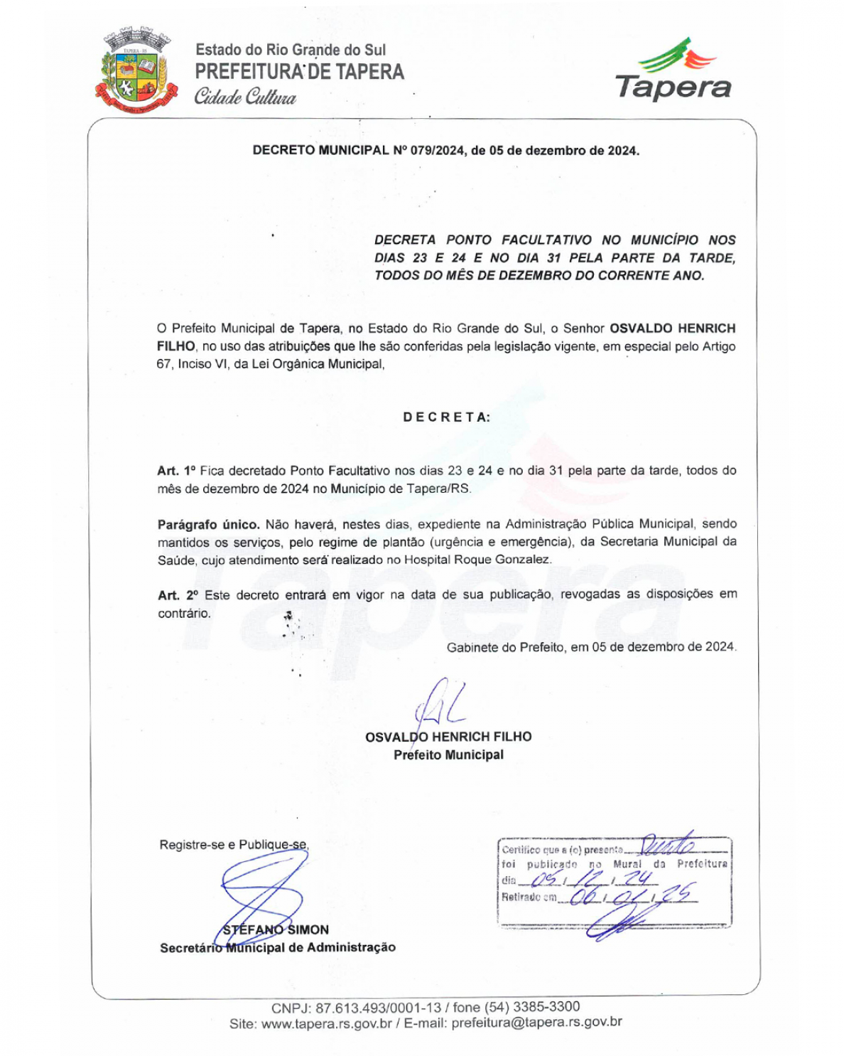 Decreta ponto facultativo no município nos dias 23 e 24, e no dia 31 pela parte da tarde, referente ao mês de dezembro de 2024.