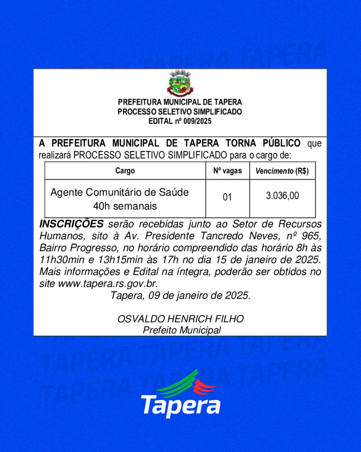 Processo Seletivo Simplificado para Agente Comunitário de Sáude da Área 18, Bairro Progresso.Inscrições somente do dia 15 de janeiro. Edital e mais informações no site da Prefeitura de Tapera.Edital: [ CLIQUE AQUI ]
