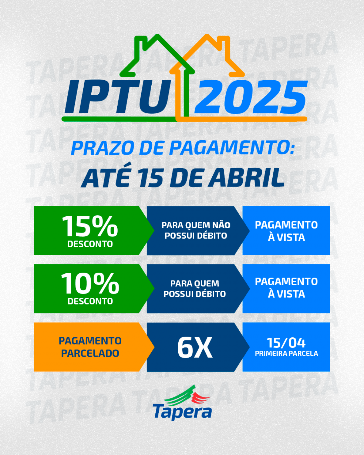 As impressões dos boletos do IPTU 2025, taxas de alvará e vigilância sanitária estarão disponíveis a partir do dia 15 de março no site da Prefeitura e na Sala do Empreendedor. Já o pagamento, estará disponível até dia 15 de ABRIL, para pagamento à vista ou da primeira parcela.