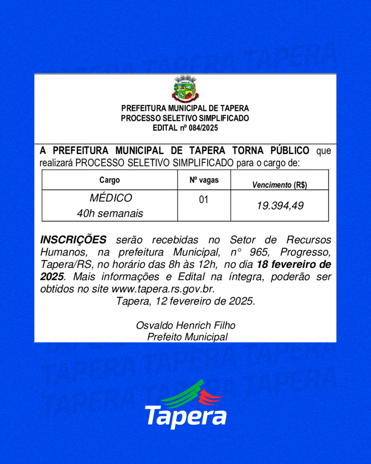 Processo Seletivo Simplificado para Médico, inscrições somente no dia 18 de fevereiro. Edital e mais informações, disponíveis no link [CLIQUE AQUI]
