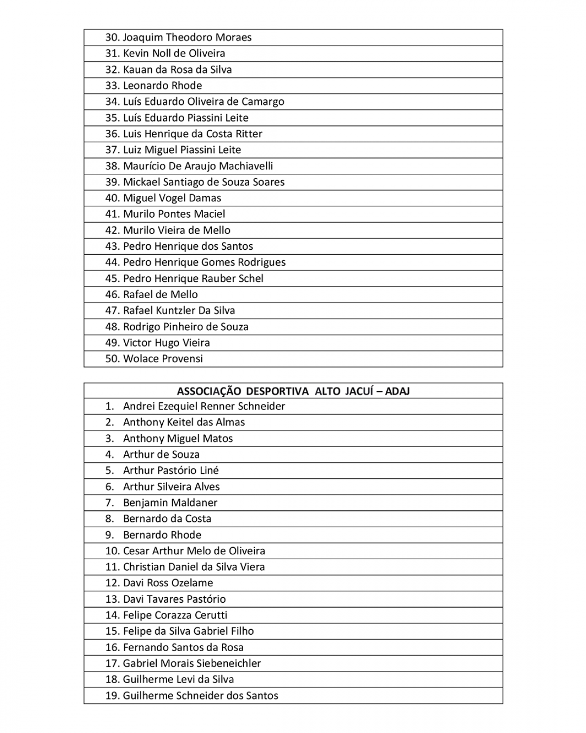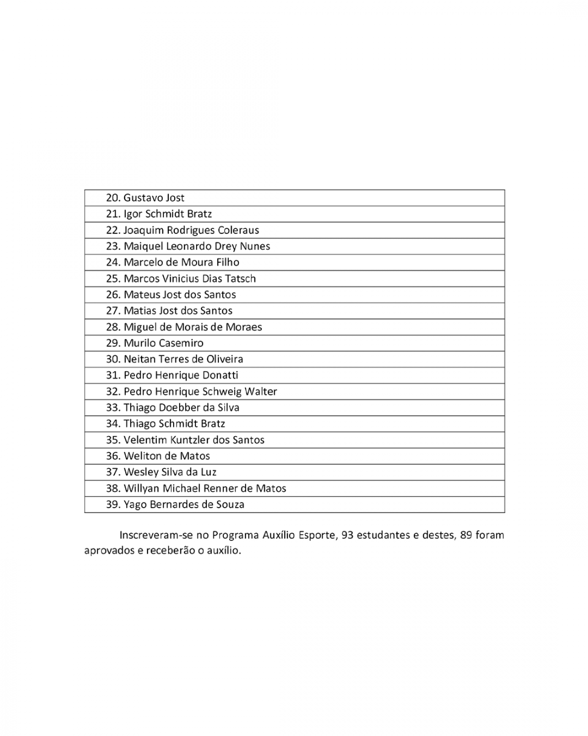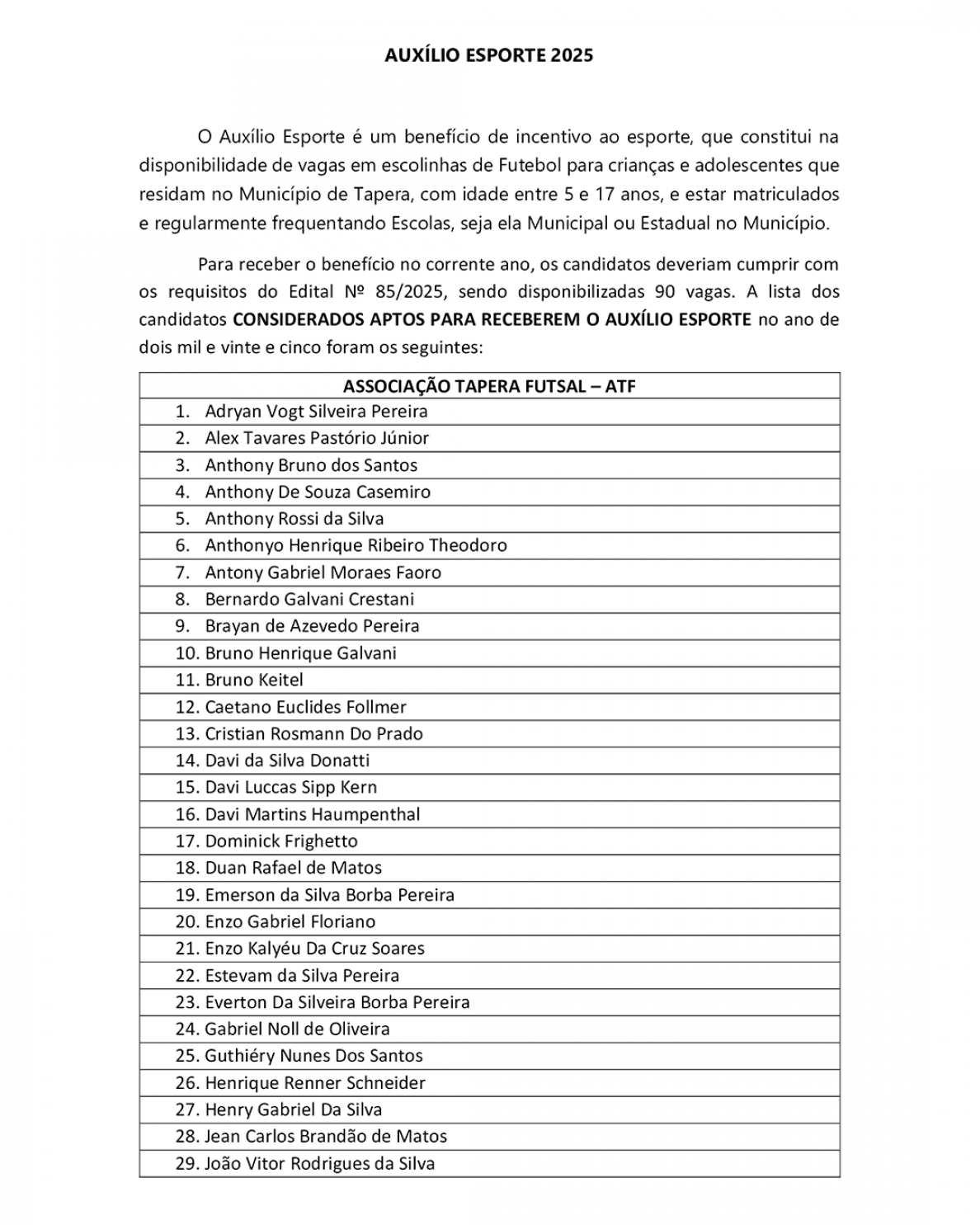 O Auxílio Esporte é um benefício de incentivo ao esporte, que constitui na disponibilidade de vagas em escolinhas de Futebol para crianças e adolescentes que residam no Município de Tapera, com idade entre 5 e 17 anos, e estar matriculados e regularmente frequentando Escolas, seja ela Municipal ou Estadual no Município. Para receber o benefício no corrente ano, os 93 candidatos deveriam cumprir com os requisitos do Edital Nº 85/2025, sendo disponibilizadas 90 vagas. A lista dos candidatos CONSIDERADOS APTOS PARA RECEBEREM O AUXÍLIO ESPORTE no ano de dois mil e vinte e cinco foram os citados em anexo.