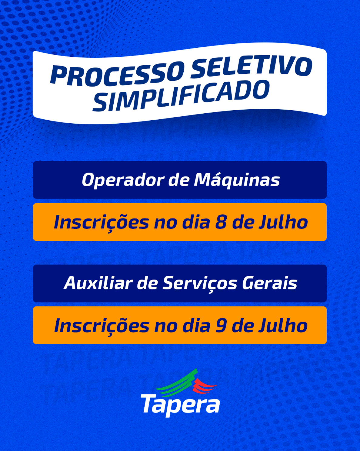 Inscrições abertas para os Processos Seletivos Simplificados de Operador de Máquinas e Auxiliar de Serviços Gerais. Atenção! As inscrições para Operador de Máquinas deverão ser entregues no dia 8 de Junho e as inscrições para Auxiliar de Serviços Gerais no dia 9 de Julho. Link: https://www.tapera.rs.gov.br/pg.php?area=PROCESSOSELETIVO&ano=2025