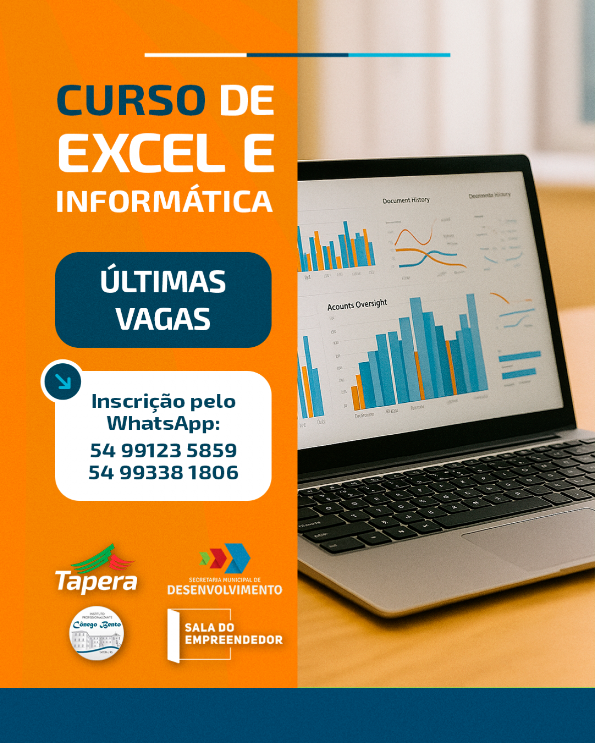 O Instituto Cônego Bento está com inscrições abertas para o Curso de Excel e Informática. As aulas acontecerão nas noites de quinta-feira, no próprio Instituto, totalizando 12 encontros. Com um conteúdo completo e voltado para o uso prático, os participantes irão aprender a criar gráficos, planilhas, orçamentos, relatórios, controles, documentos no Word, currículos, contratos, configurações, digitação e muito mais. O investimento é de R$ 700,00 por aluno, com possibilidade de parcelamento em até 3 vezes via Pix. As inscrições devem ser feitas pelos WhatsApps (54) 99123-5859 ou (54) 99338-1806. A data de início será informada assim que forem confirmadas 12 inscrições. Últimas vagas disponíveis! Aproveite a oportunidade de se qualificar com um curso acessível e com conteúdo prático para o dia a dia.