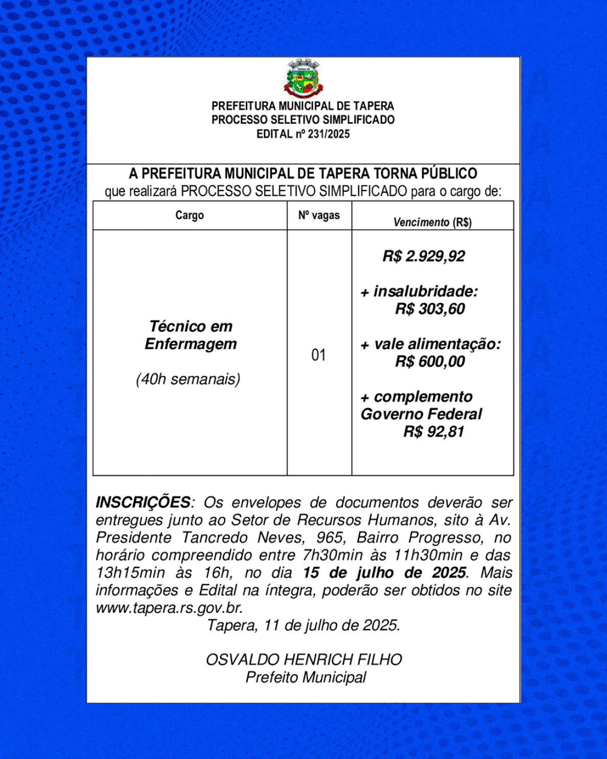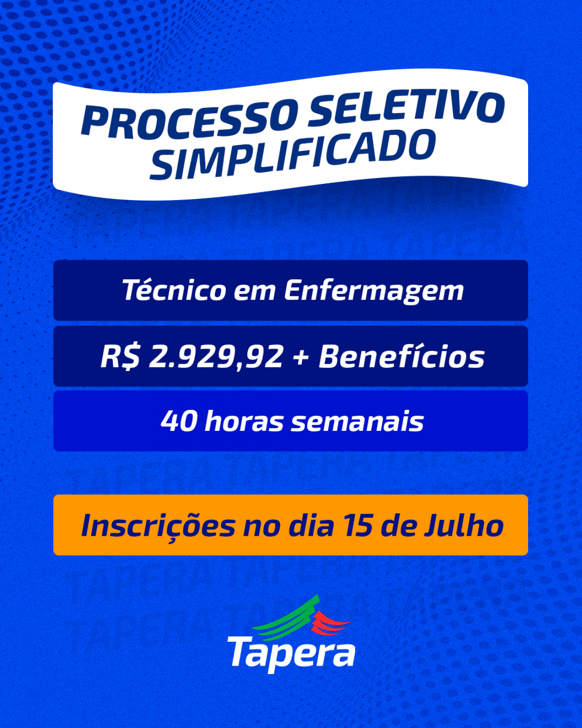 Inscrições abertas para o Processo Seletivo Simplificado de Técnico em Enfermagem, as inscrições deverão ser entregues no dia 15 de julho. Edital e mais informações no site da Prefeitura de Tapera. Link: https://www.tapera.rs.gov.br/pg.php?area=PROCESSOSELETIVO&ano=2025