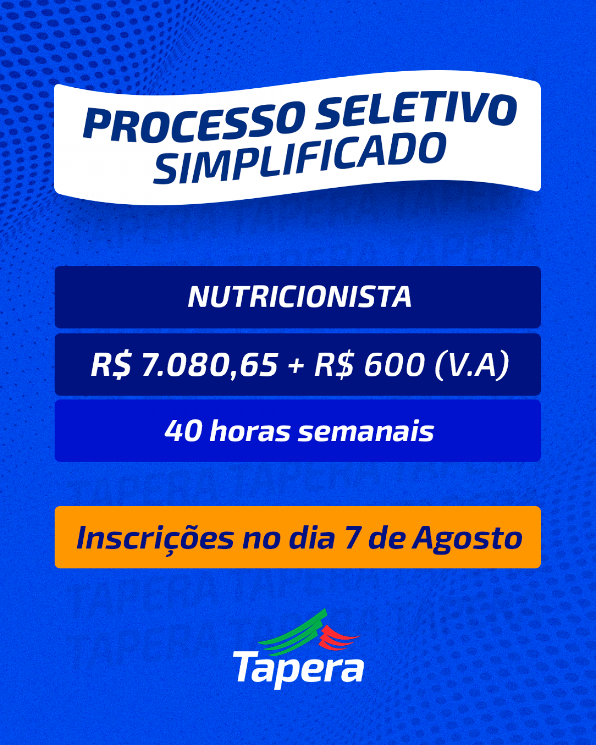 No dia 7 de agosto, estarão abertas as inscrições para o Processo Seletivo Simplificado de Nutricionista, edital e mais informações no site da Prefeitura de Tapera. Link: https://www.tapera.rs.gov.br/pg.php?area=PROCESSOSELETIVO&ano=2025