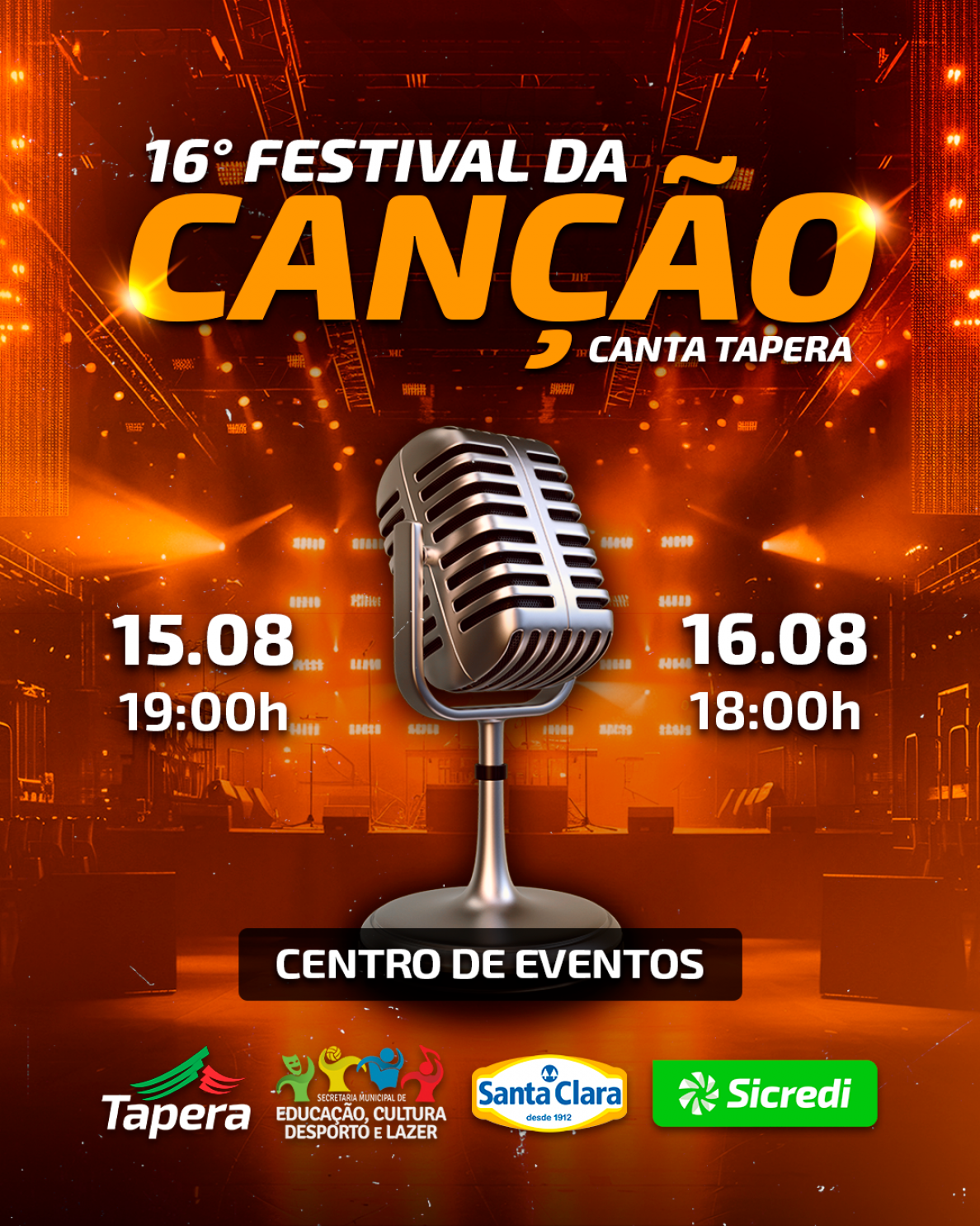 Nos dias 15 e 16 de agosto, o Centro de Eventos será palco de grandes apresentações musicais, reunindo talentos locais e regionais em duas noites de muita arte e emoção. O evento, que é gratuito, promete encantar o público com interpretações marcantes, diversidade de estilos e o carisma de músicos que dão voz à cultura e à música da nossa região. Uma oportunidade imperdível para prestigiar e incentivar nossos artistas. Participe e viva essa experiência musical!
