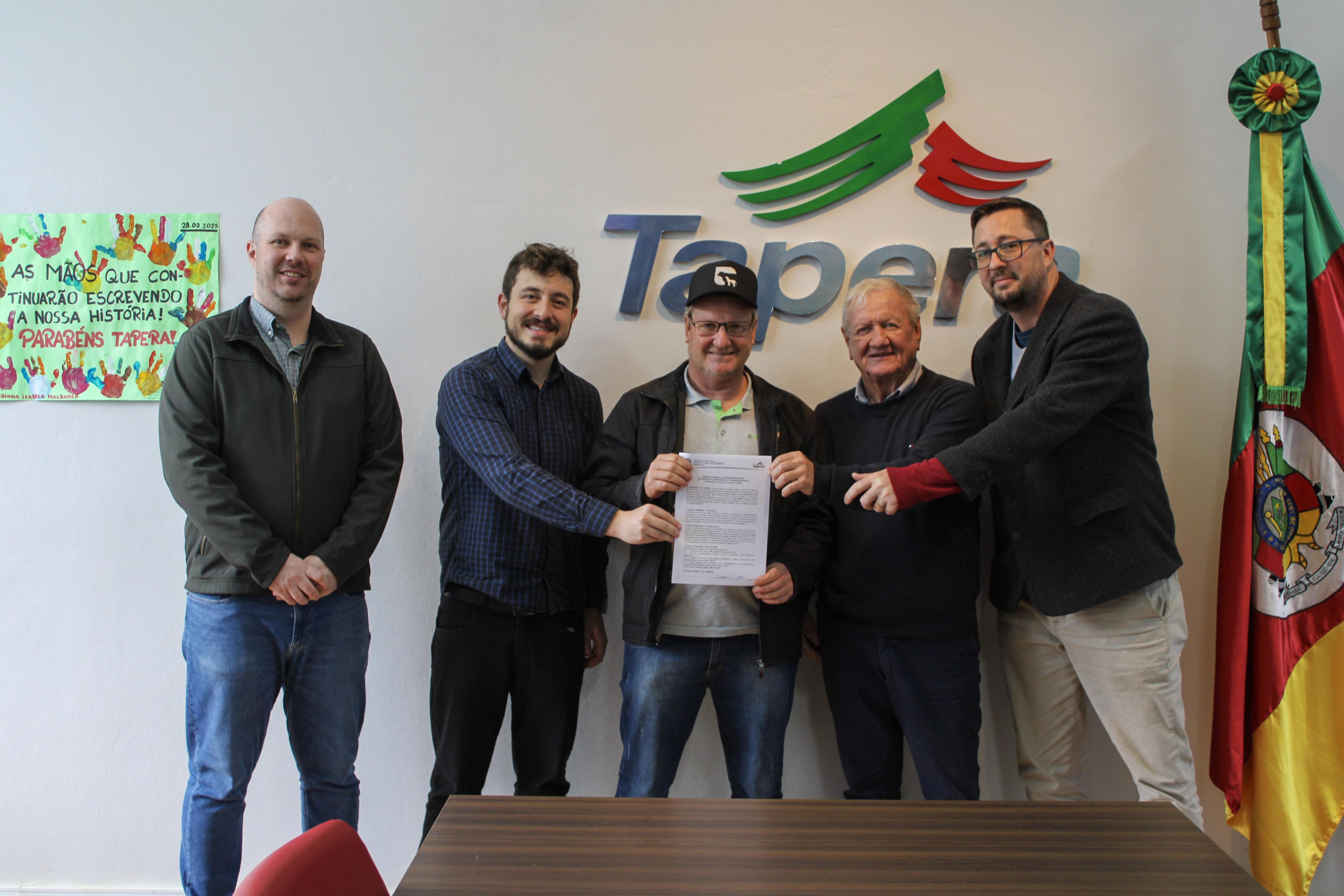 Nesta quinta-feira, 14/08, foi assinado o contrato de incentivo do Programa Municipal PROAGROINDÚSTRIAS entre a Prefeitura de Tapera e o produtor rural Jair Ebert, primeiro beneficiário do programa. O documento oficializa o repasse financeiro destinado a apoiar e fortalecer a atividade agroindustrial no município.