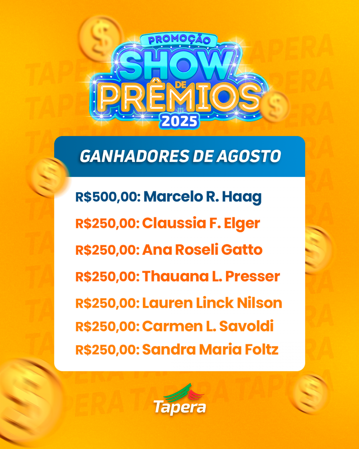 Até o presente momento, foram cadastradas 13.010 cartelas, totalizando R$1.294.285,30 em documentos fiscais. Confira os ganhadores de julho: 1º Prêmio – R$ 500,00: Marcelo Ricardo Haag 2º Prêmio – R$ 250,00: Claussia Fernanda Elger 3º Prêmio – R$ 250,00: Ana Roseli Gatto 4º Prêmio – R$ 250,00: Thauana Lupatini Presser 5º Prêmio – R$ 250,00: Lauren Linck Nilson 6º Prêmio – R$ 250,00: Carmen Lucia Monteiro Savoldi 7º Prêmio – R$ 250,00: Sandra Maria Foltz O próximo sorteio será realizado no dia 30 de setembro. A Administração Municipal agradece a participação de todos e reforça a importância de valorizar o comércio local. Participe dos próximos sorteios!