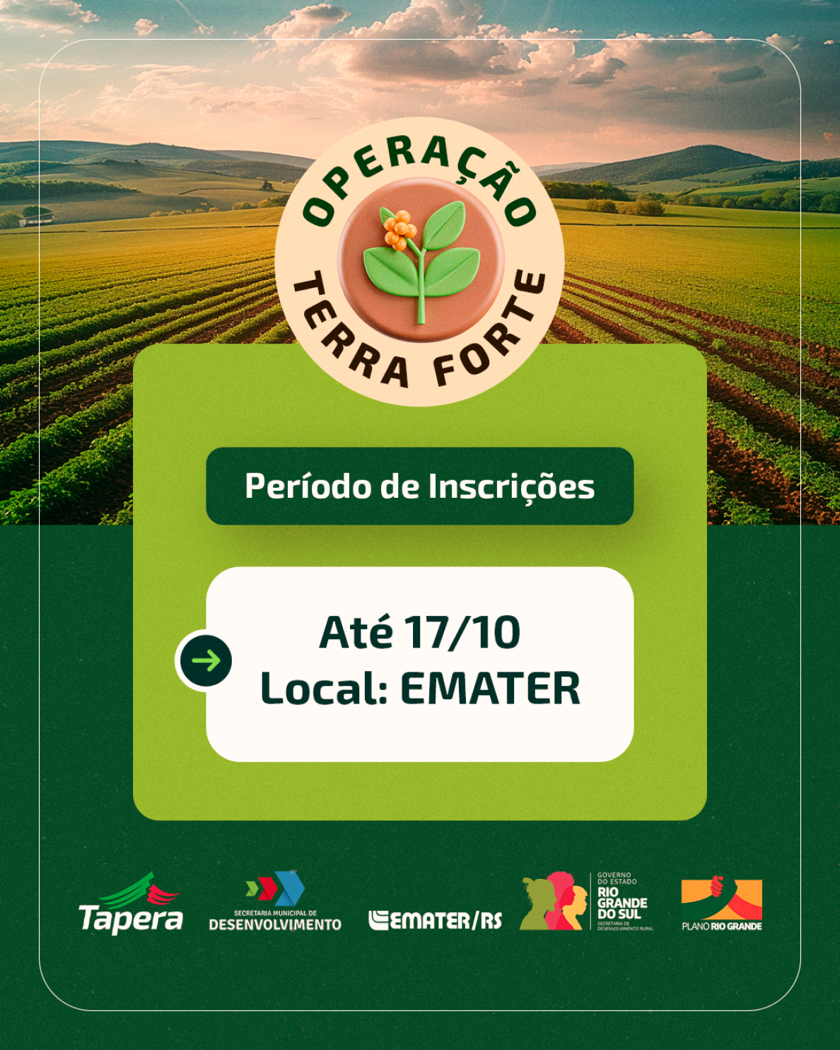 Documentação necessária: Documento de Identificação, Cadastro Nacional da Agricultura Familiar (CAF) ativo, ou Declaração de Aptidão ao Pronaf (DAP) ativa, ou ainda, Declaração de Pecuarista Familiar (DPF) assinada. O programa da Secretaria de Desenvolvimento Rural (SDR), executado pela Emater/RS-Ascar, terá investimento inicial de R$ 300 milhões, para recuperar solos e fortalecer a agricultura familiar, promovendo produção rural sustentável e resiliência climática. Serão 15 mil beneficiários diretos! As ações do Terra Forte abrangem 12 linhas tecnológicas, adaptadas à diversidade produtiva do RS, incluindo pastagens, sistemas integrados, plantio direto, florestas, sistemas irrigados e fruticultura. Procure o escritório da Emater/RS-Ascar de Tapera para se inscrever!