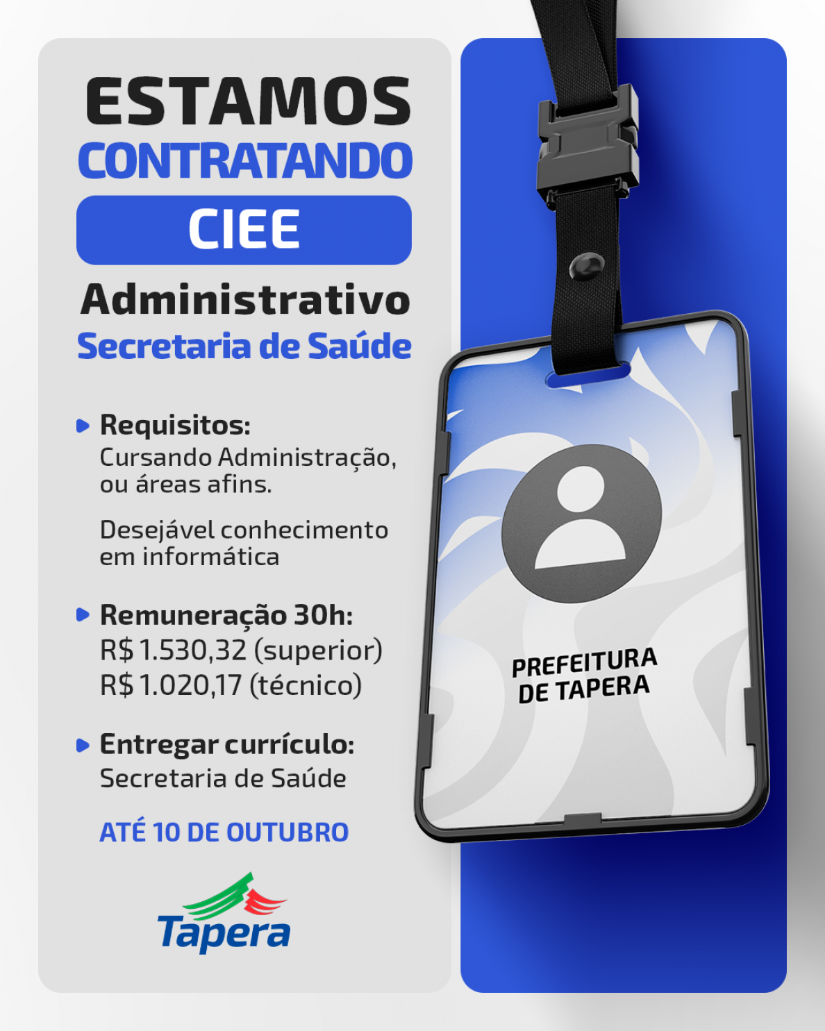 A Prefeitura de Tapera, por meio da Secretaria Municipal de Saúde, está com oportunidade aberta para contratação de estagiário do CIEE na área administrativa.