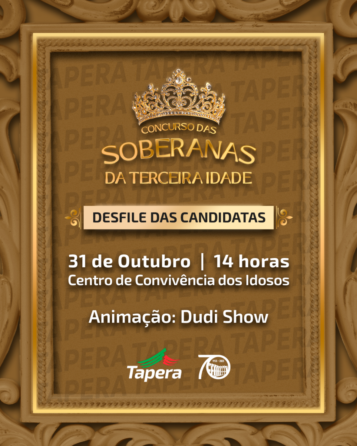 No dia 31 de outubro, a partir das 14 horas, no Centro de Convivência dos Idosos, acontecerá o desfile para a escolha da nova corte de soberanas da Terceira Idade de Tapera.