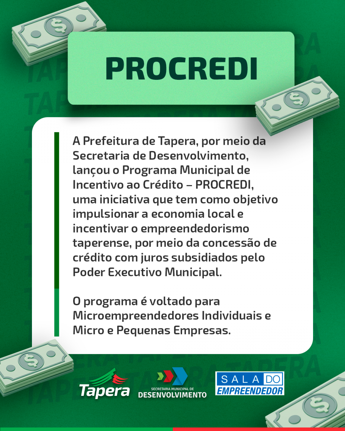 A Prefeitura de Tapera, por meio da Secretaria Municipal de Desenvolvimento, lançou o Programa Municipal de Incentivo ao Crédito – PROCREDI, uma iniciativa que tem como objetivo impulsionar a economia local e incentivar o empreendedorismo taperense, por meio da concessão de crédito com juros subsidiados pelo Poder Executivo Municipal.