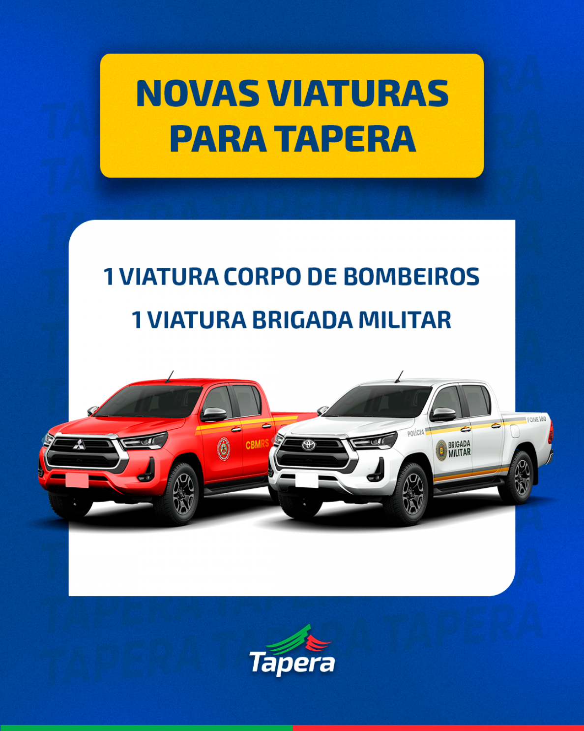 O município de Tapera foi contemplado com duas novas viaturas, sendo uma destinada ao Corpo de Bombeiros Militar e outra à Brigada Militar. A destinação das viaturas integra um investimento do Governo do Estado que totaliza mais de R$ 100 milhões na aquisição de 361 veículos para a Brigada Militar, Corpo de Bombeiros Militar e Instituto-Geral de Perícias.