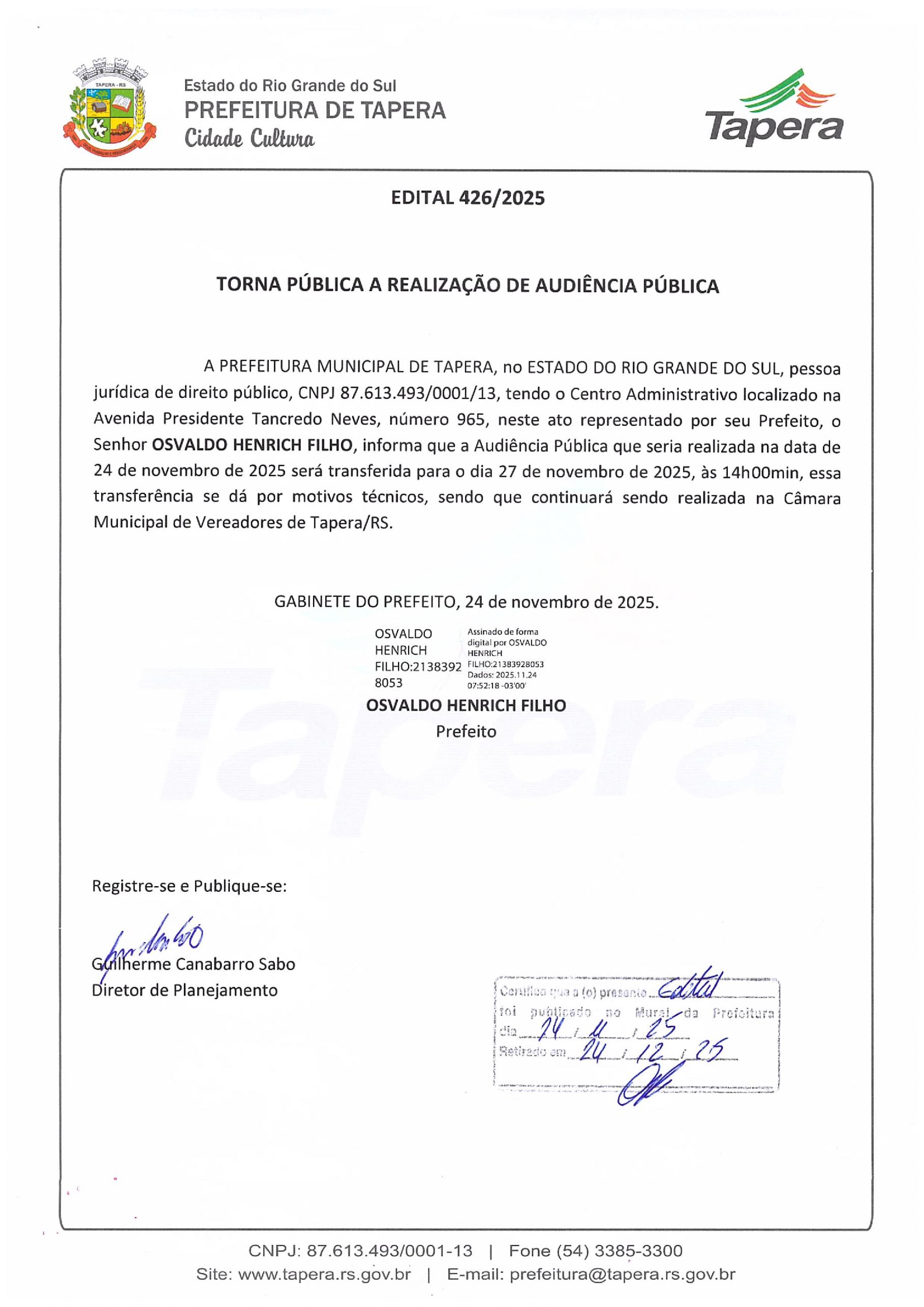 A audiência seguirá sendo realizada na Câmara Municipal de Vereadores de Tapera/RS. O comunicado oficial foi assinado pelo Prefeito Osvaldo Henrich Filho e publicado pelo Diretor de Planejamento, Guilherme Canabarro Sabo.