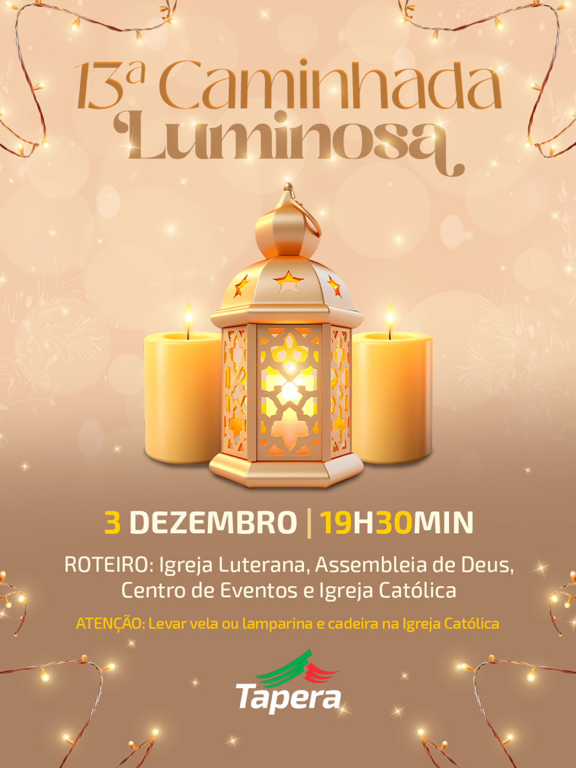 No dia 3 de dezembro, às 19h30min, Tapera viverá mais um momento especial de união e espiritualidade com a realização da 13ª Caminhada Luminosa. O evento já se tornou uma tradição no município, reunindo famílias e comunidade em um gesto coletivo de fé, luz e esperança. O percurso passará pela Igreja Luterana, Assembleia de Deus, Centro de Eventos e Igreja Católica, fortalecendo o espírito de integração entre as igrejas e celebrando o verdadeiro significado do período natalino. Os participantes devem levar vela ou lamparina para iluminar a caminhada, além de cadeira para a atividade final na Igreja Católica. A Administração Municipal convida toda a comunidade a participar deste momento marcante, que ilumina as ruas e aquece os corações taperenses.