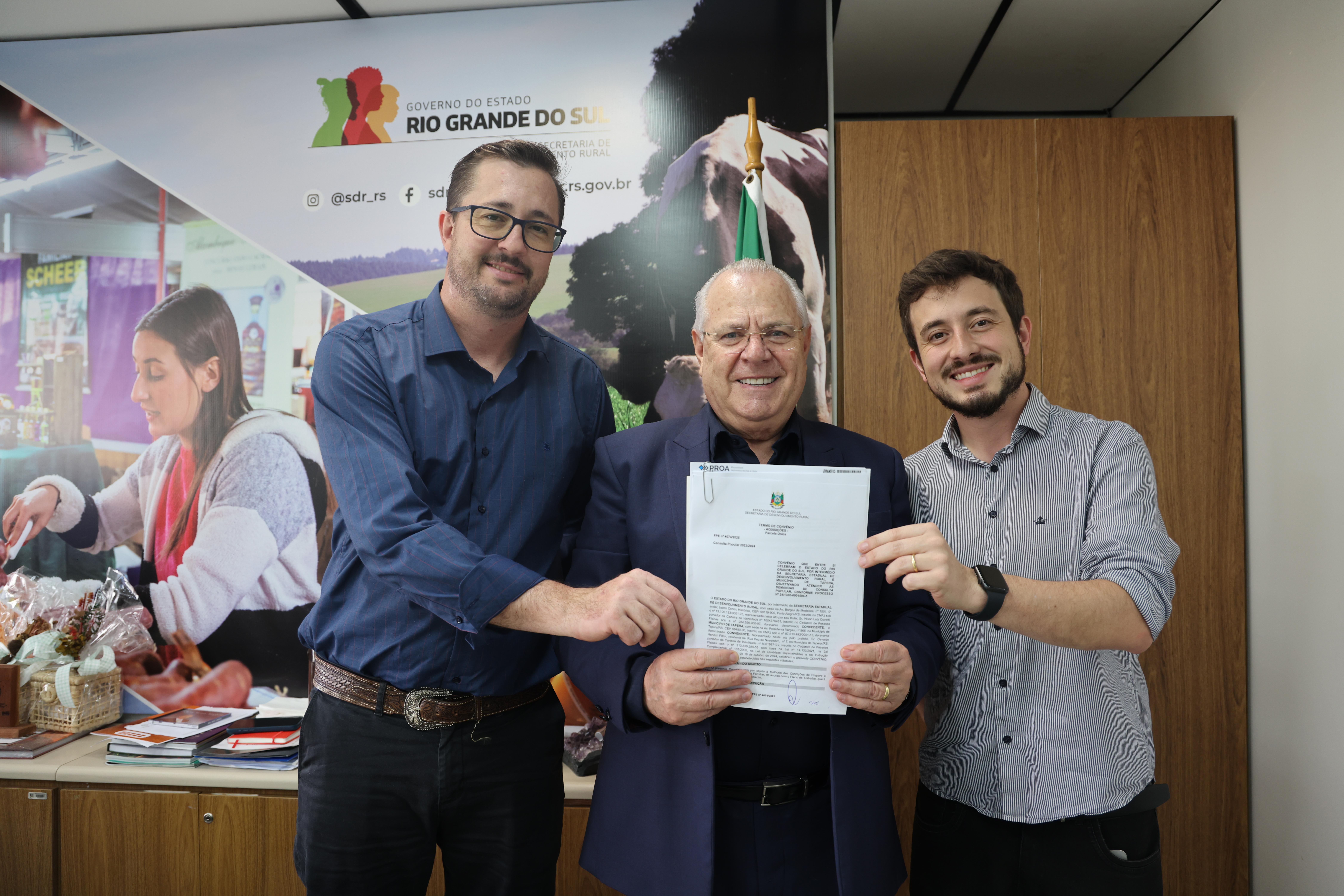 O Secretário Municipal do Desenvolvimento, Elias Goulart, acompanhado do Diretor de Agricultura e Meio Ambiento, Tiago Schmidt, participaram na manhã desta terça-feira, 09 de dezembro, do Ato de Assinatura da Consulta Popular, realizado na Secretaria de Desenvolvimento Rural, em Porto Alegre.