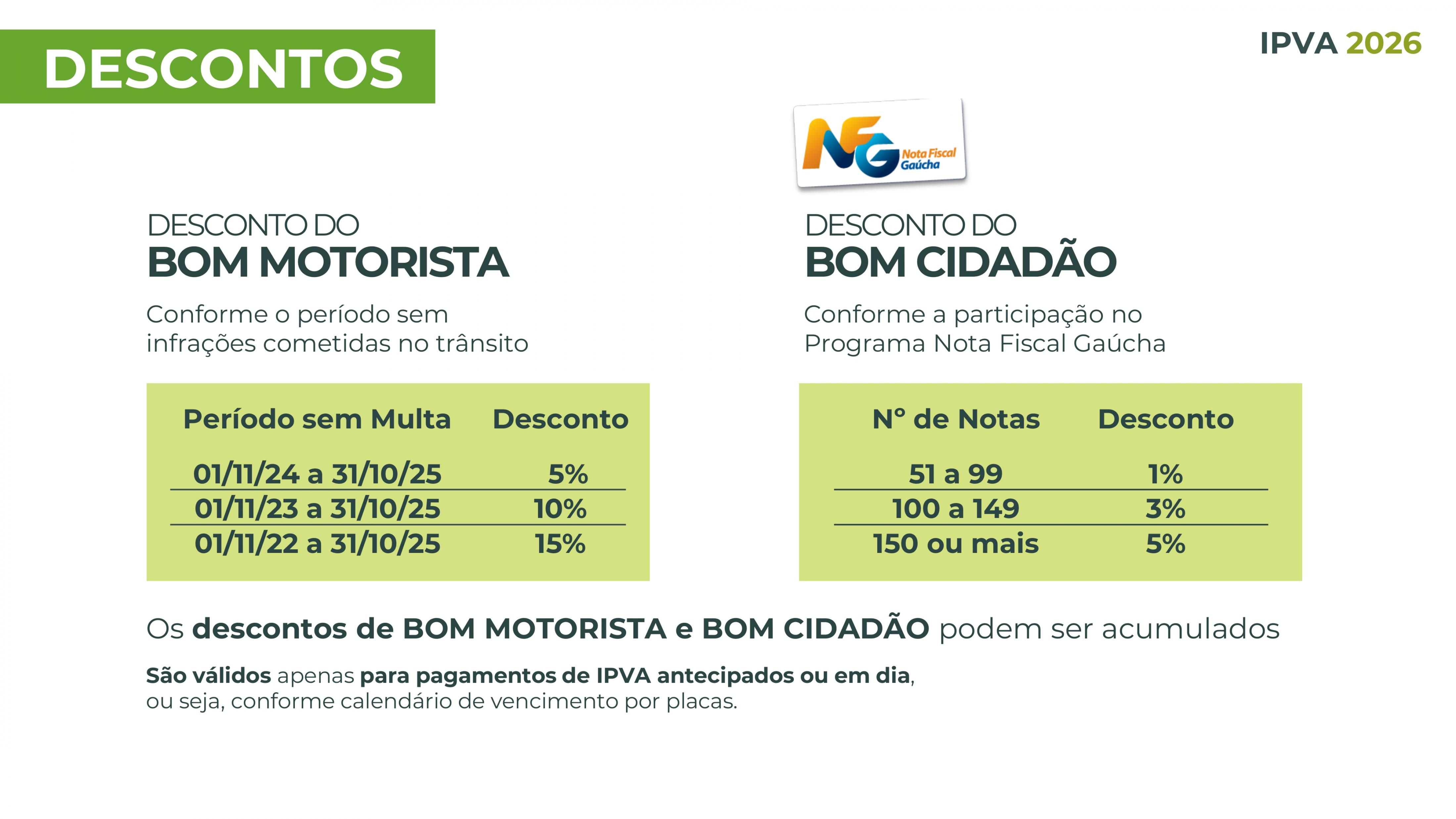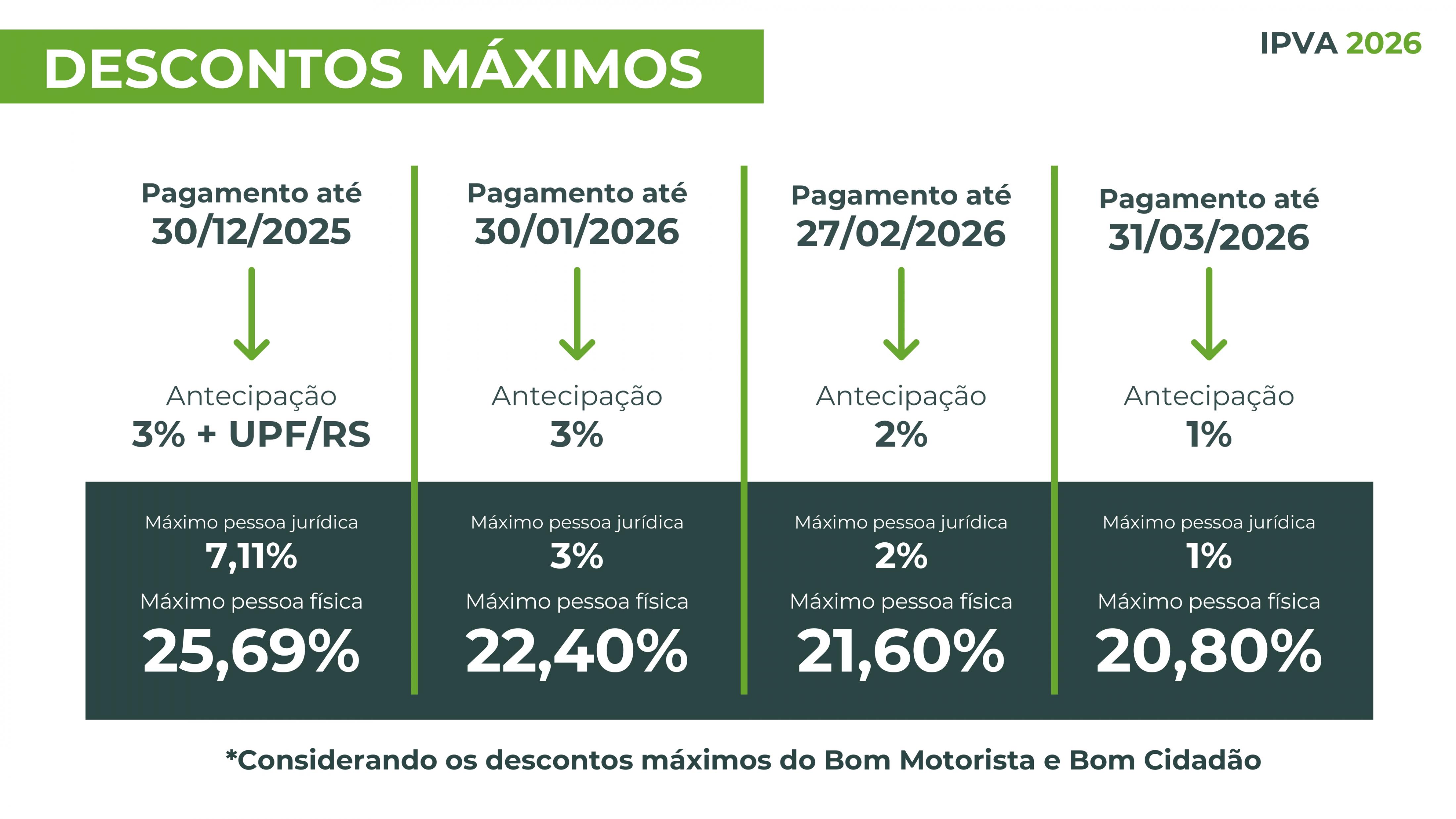 Quem quitar o imposto até 30 de dezembro terá desconto de 3% pela antecipação, além de evitar a atualização pela variação da UPF/RS (estimada em 4,43%), o que representa uma redução potencial de 7,11%. Mas as vantagens não param por aí: somando os benefícios do Bom Motorista e do Bom Cidadão, o abatimento pode chegar a 25,69% sobre o valor total do tributo.
