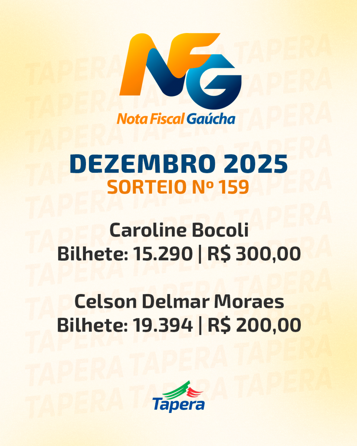 O sorteio municipal da Nota Fiscal Gaúcha, referente ao mês de dezembro de 2025, premiou dois cidadãos de Tapera.