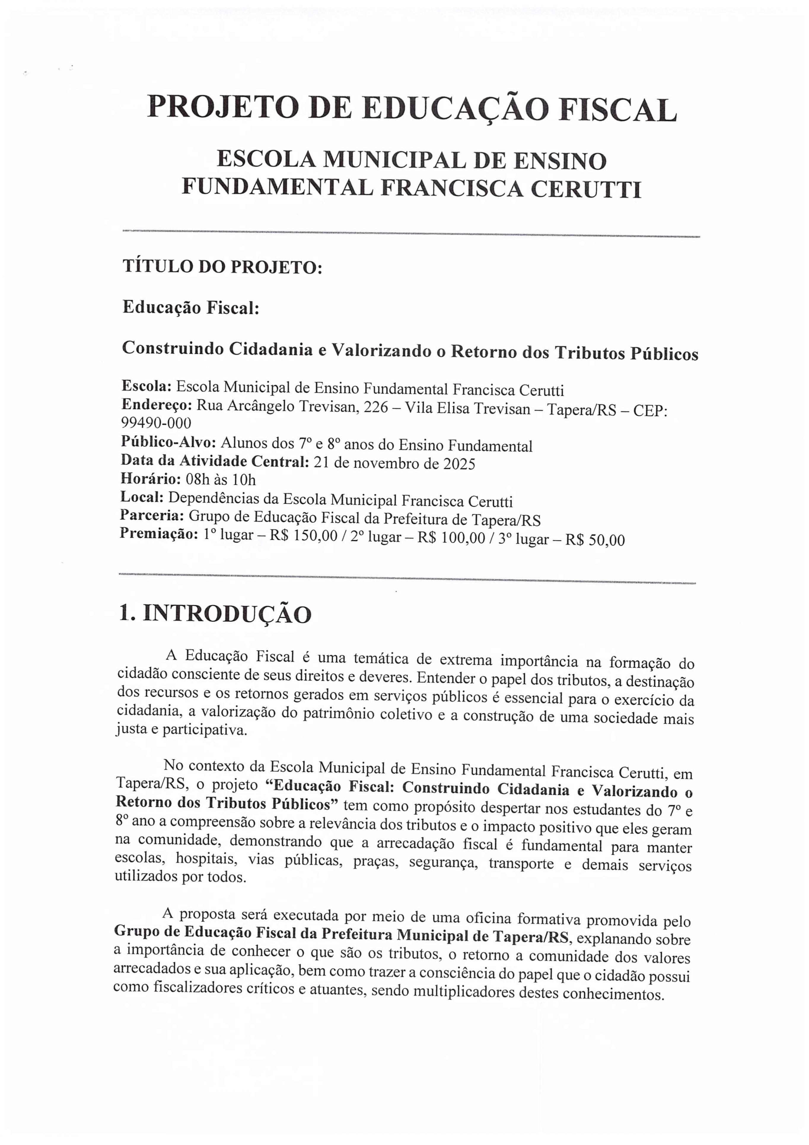 A Escola Municipal de Ensino Fundamental Francisca Cerutti desenvolveu o projeto “Educação Fiscal: Construindo Cidadania e Valorizando o Retorno dos Tributos Públicos”, com o objetivo de conscientizar os alunos do 7º e 8º anos sobre a importância dos tributos e o papel fundamental que exercem na manutenção dos serviços públicos e no desenvolvimento da sociedade.
