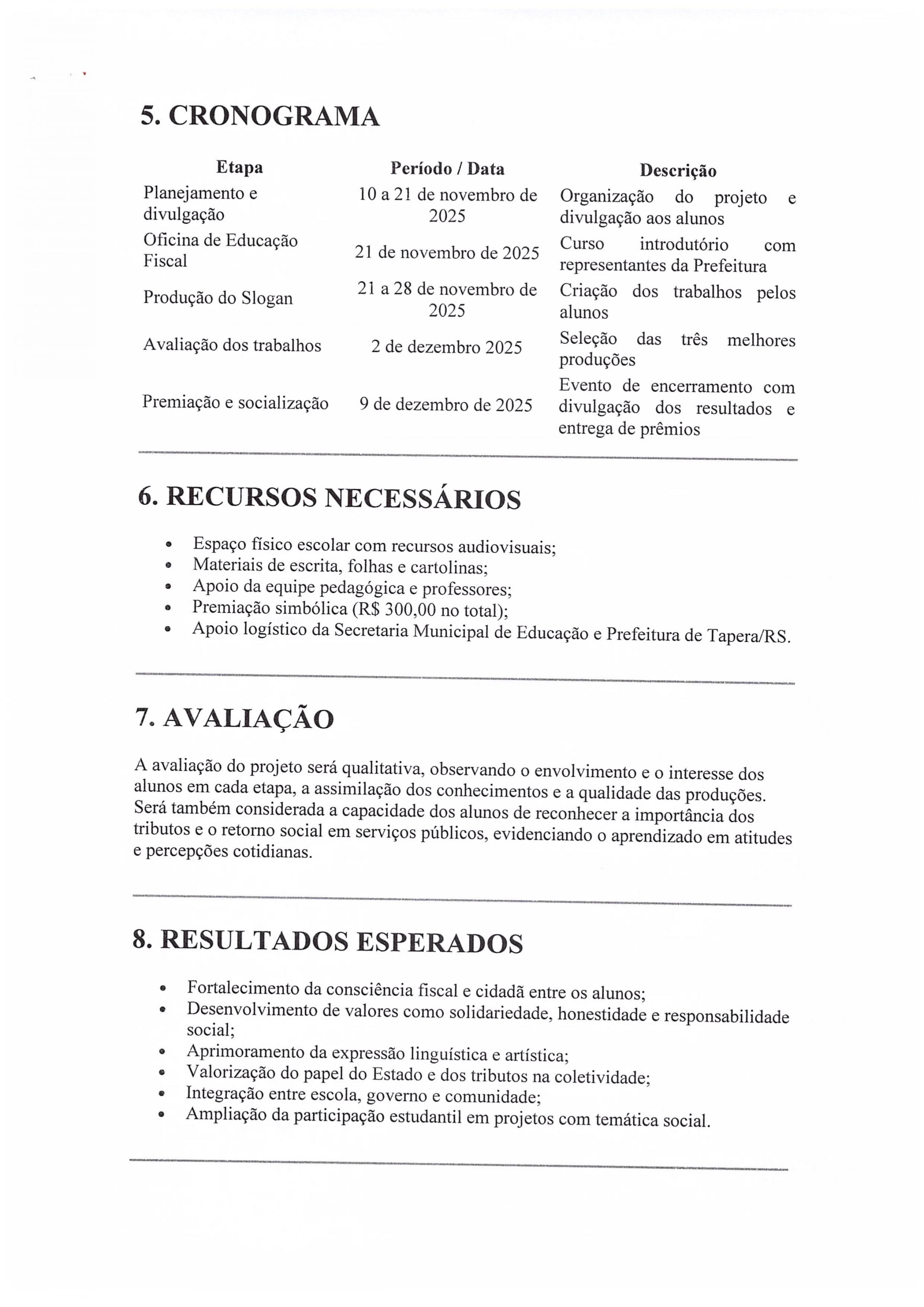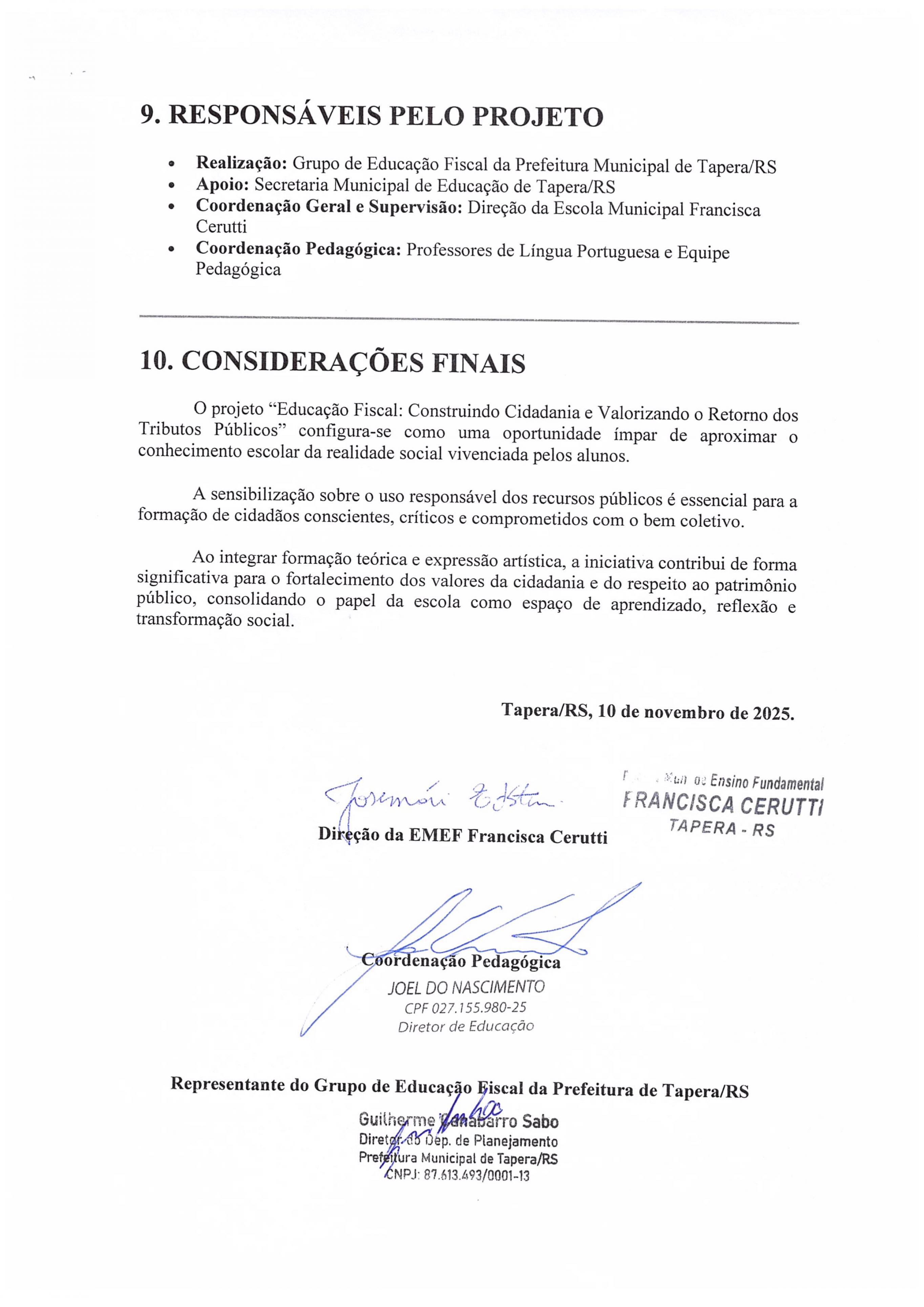 O projeto reforça o compromisso da Administração Municipal e da comunidade escolar com a formação cidadã, promovendo a consciência fiscal, o senso de responsabilidade social e a compreensão do papel do Estado, além de integrar escola, Prefeitura e comunidade em um processo educativo participativo e transformador.