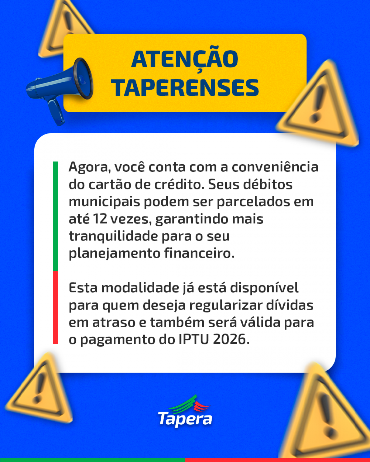 Atenção, contribuinte de Tapera! A Administração Municipal traz uma importante novidade para facilitar o pagamento dos seus tributos.
