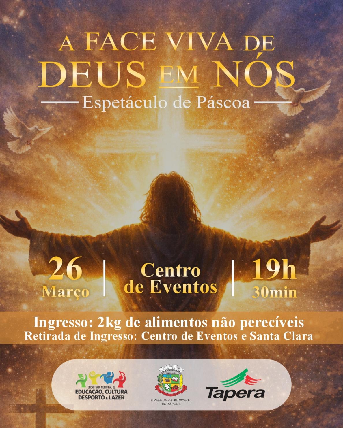 Neste ano, o espetáculo “A Face Viva de Deus em Nós” será apresentado no dia 26 de março, às 19h30min, no Centro de Eventos. A apresentação promete tocar o público com uma encenação que relembra o verdadeiro significado da Páscoa, destacando valores como amor, esperança, fé e renovação.