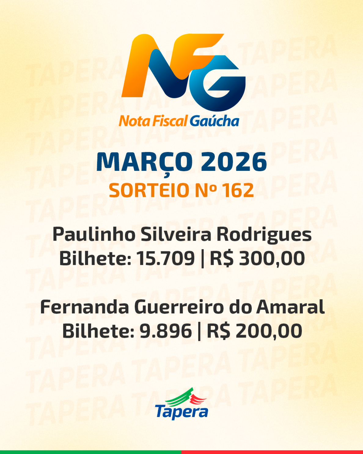 O sorteio municipal da Nota Fiscal Gaúcha, referente ao mês de março de 2026, premiou dois cidadãos de Tapera. Os contemplados foram Paulinho Silveira Rodrigues, com o bilhete nº 15.709, que recebeu R$ 300,00, e Fernanda Guerreiro do Amaral, com o bilhete nº 9.896, que ganhou R$ 200,00. O sorteio de número 162, foi realizado no dia 2 de abril de 2026, às 11h04, contando com 29.289 bilhetes participantes.