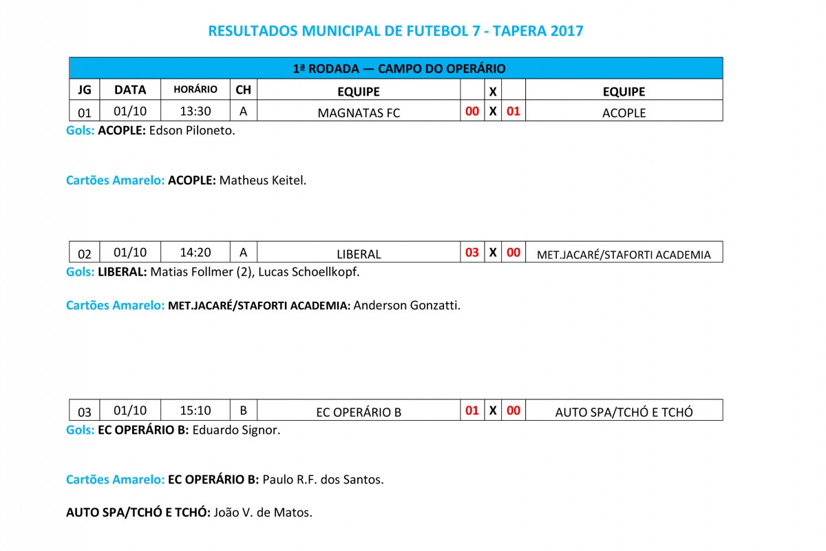 A 2ª rodada acontecerá no feriado de 12/10, no campo da Agrotap, com jogos entre: Bom Sucesso X Manc. City/JM Construções (13h30), Desportivo F.C. X São Luiz F.C. (14h20); Juventude Vila Raspa X Ser Veja (15h10); Met. Jacaré/ Staforti Academia X Lira Construções (16h); Operário A X GF Pneus (16h50).