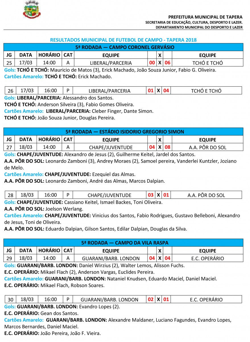 No domingo (08/04), os jogos serão realizados no campo da Vila Raspa, entre Guarani/ Barbearia London X Liberal/ Parceria; e no campo municipal José Siqueira entre A.A. Pôr do Sol X E.C. Operário. Os jogos da categoria Aspirante começarão às 13h45 e da Principal às 15h45.